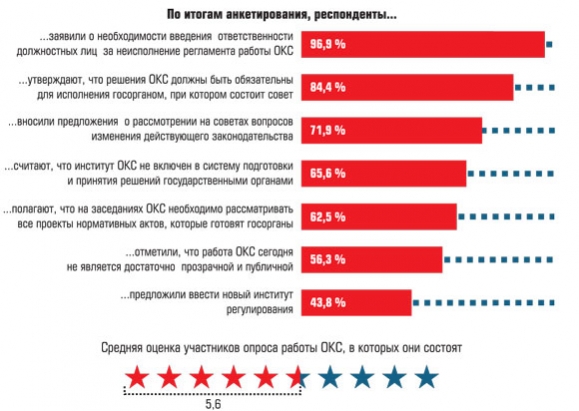Участники опроса оценили работу ОКСов в среднем на 5,6 балла из 10 возможных. «Это общий тренд. По нашему мнению, в действительности приблизительно так и есть: кто-то работает и полностью удовлетворен, а кто-то не работает. Есть ОКСы, которые собираются как минимум раз в квартал и обсуждают широкий перечень вопросов, а есть и такие, которые собираются раз в год», — отметил Евгений Мордосевич.
